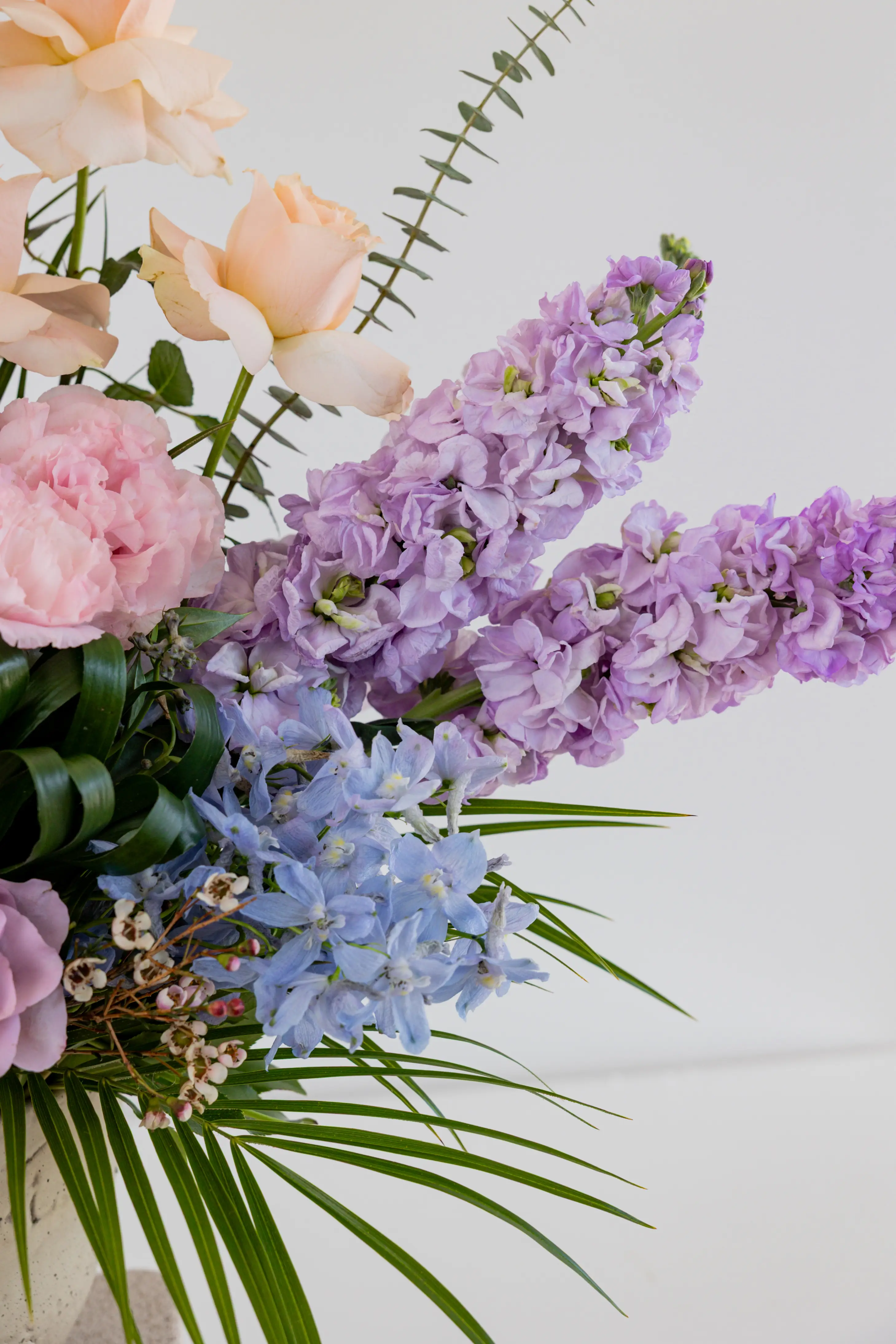 Aranjmanda farklı renklerde şebboy, gül, anastasia ve delfinyum kullanılmıştır. Aranjmanda yeşil yapraklar ve tamamlayıcı çiçek detayları yer almaktadır; mavi, lila, pembe, somon ve yeşil tonlar özenle kombinlenmiştir. Mevsime göre aranjmanda kullanılan çiçek yoğunluğu, detaylar ve alt obje değişiklik gösterebilir.