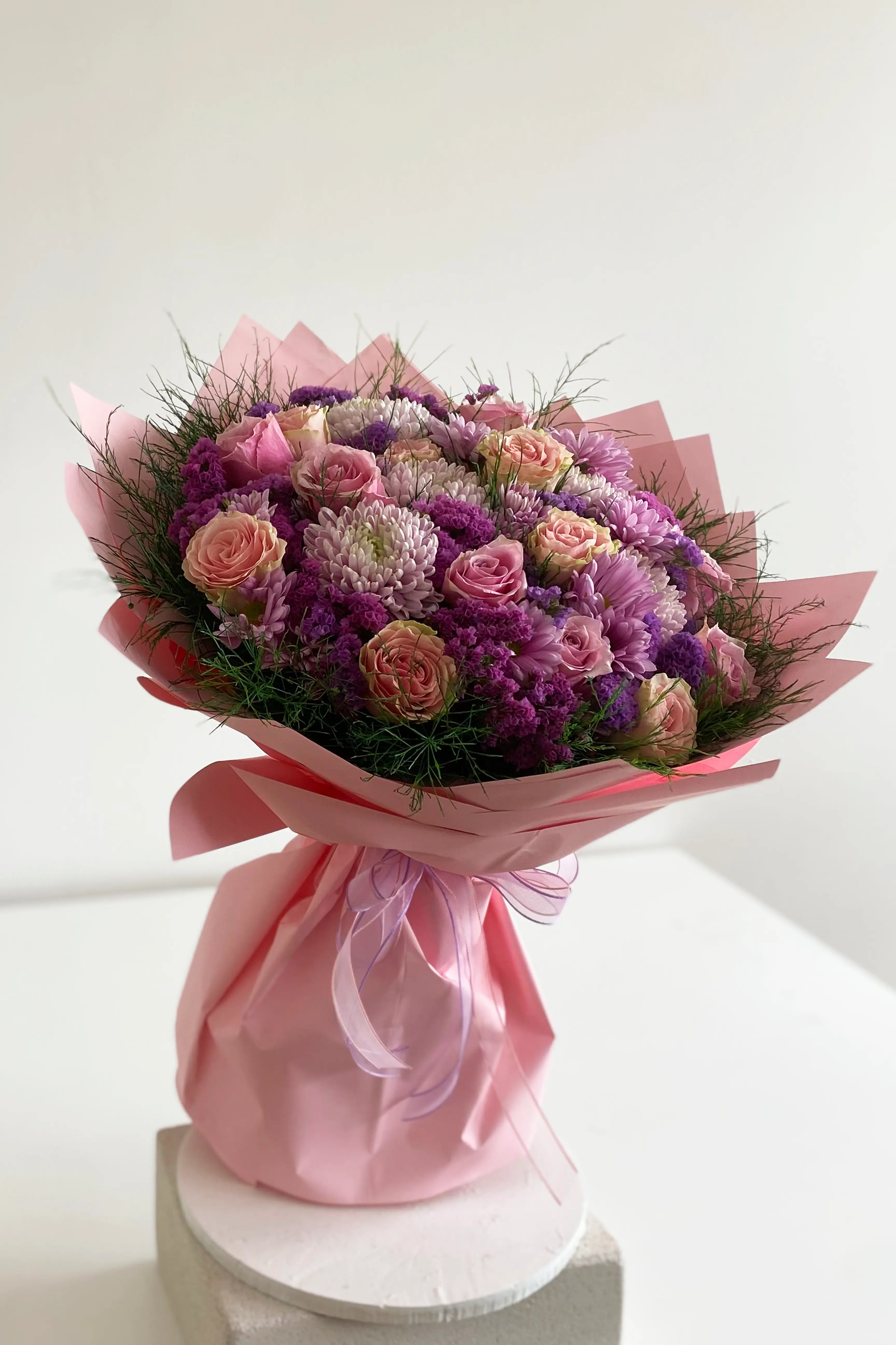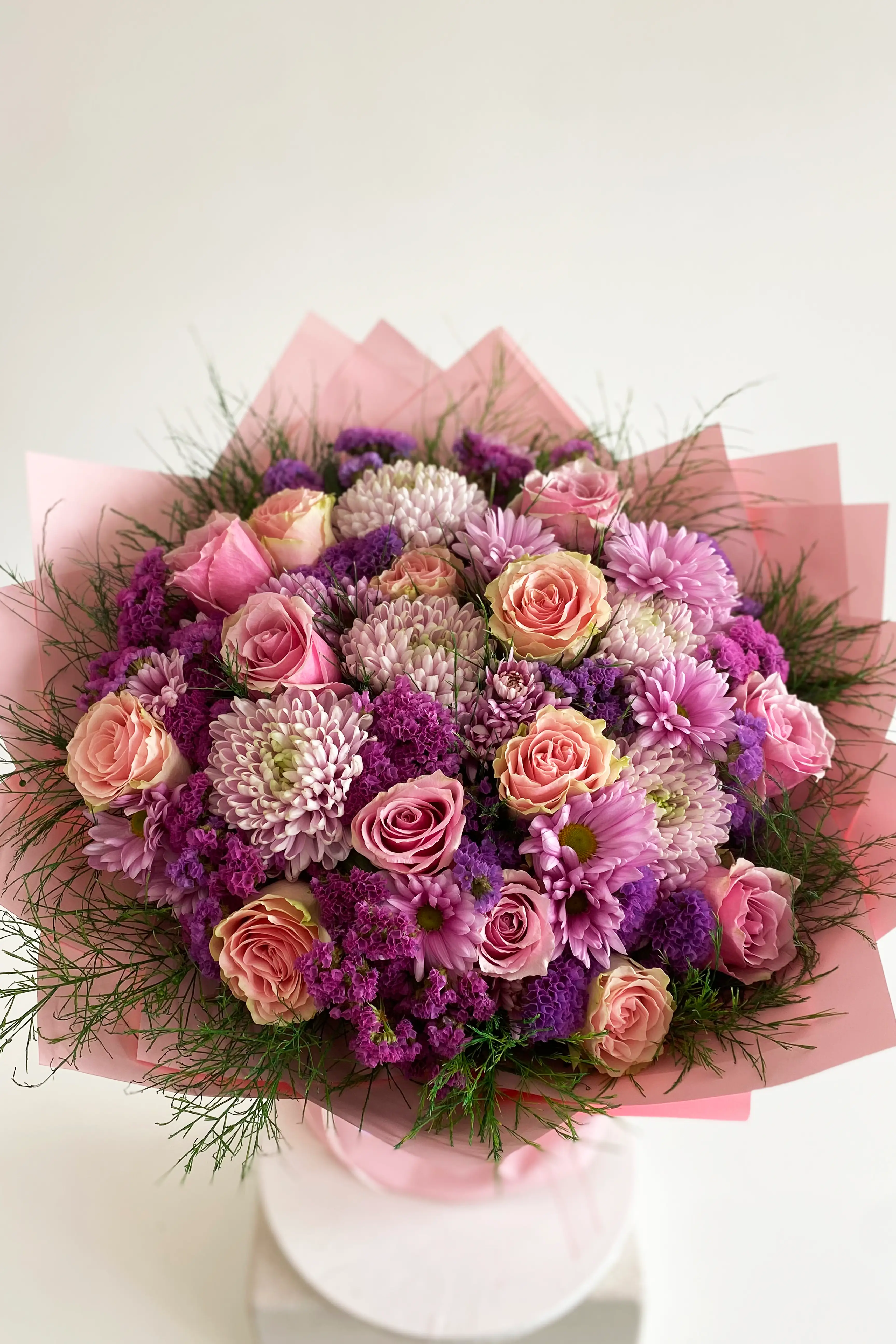 Bukette açık pembe athena gül kullanılmıştır. Bukette çiçekler, yeşil yapraklar ve tamamlayıcı detaylar yer almaktadır; pembe ve yeşil tonlar özenle kombinlenmiştir. Devamını Göster